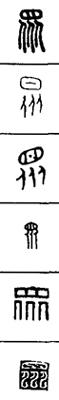 从上到下依次是小篆、甲骨文、金文、古玺及战国文字、缪篆及汉代文字、鸟虫篆。