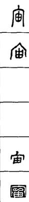 从上到下依次是小篆、甲骨文、金文、古玺及战国文字、缪篆及汉代文字、鸟虫篆。