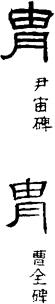 【说明】甲胄意义的“胄”与后裔意义的“胄”本是两个形体不同的字,前者形旁为“曰”(古“帽”字),后者形旁为“肉”。隶书混而为一。