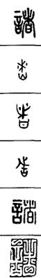 从上到下依次是小篆、甲骨文、金文、古玺及战国文字、缪篆及汉代文字、鸟虫篆。