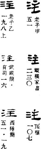 〈辨〉注字从水,本义为灌入;其他义项皆由本义引申。而义项④⑤⑥旧又写作註,从言主声,是为注解新造的专字。今一并写作注。