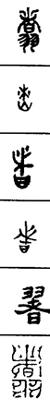 从上到下依次是小篆、甲骨文、金文、古玺及战国文字、缪篆及汉代文字、鸟虫篆。