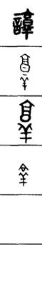 从上到下依次是小篆、甲骨文、金文、古玺及战国文字、缪篆及汉代文字、鸟虫篆。