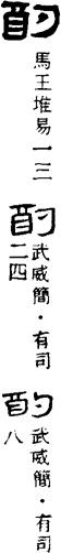 从上到下依次是小篆、甲骨文、金文、古玺及战国文字、缪篆及汉代文字、鸟虫篆。