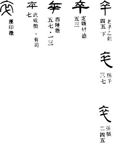 【说明】“卒”为象形字,像带有特殊标记的衣服形。参附录三。
