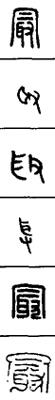 从上到下依次是小篆、甲骨文、金文、古玺及战国文字、缪篆及汉代文字、鸟虫篆。