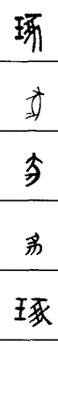 从上到下依次是小篆、甲骨文、金文、古玺及战国文字、缪篆及汉代文字、鸟虫篆。