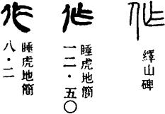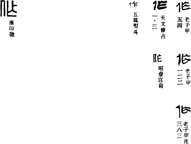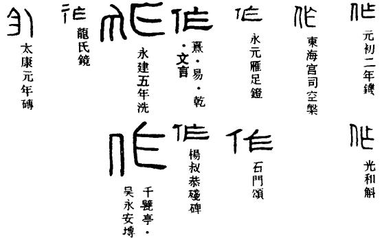 敦研004(2-1)《優婆塞戒經》:“善男子!衆生作罪,凡有二種。”浙敦026《普賢菩薩說證明經》:“老子作相師,白疊(氈)承釋迦。”敦研225《大般涅槃經》卷三十七:“作業果断。”敦研139《百喻經》:“爲佛作礼受教。”敦研125《大般涅槃經》:“凡是作者,猶如城郭樓觀却敵。”按:此形敦煌寫本中最爲常見,尤其楷書寫本。可見俗字根源在於隸書。