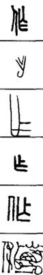 从上到下依次是小篆、甲骨文、金文、古玺及战国文字、缪篆及汉代文字、鸟虫篆。
