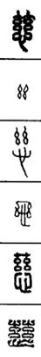 从上到下依次是小篆、甲骨文、金文、古玺及战国文字、缪篆及汉代文字、鸟虫篆。