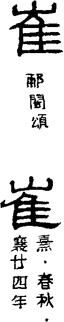 cuī 《广韵》:姓也。 仓回切 蟹合一平灰清 又《广韵》:崔嵬。 昨回切 蟹合一平灰从