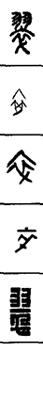 从上到下依次是小篆、甲骨文、金文、古玺及战国文字、缪篆及汉代文字、鸟虫篆。