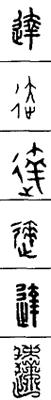 从上到下依次是小篆、甲骨文、金文、古玺及战国文字、缪篆及汉代文字、鸟虫篆。