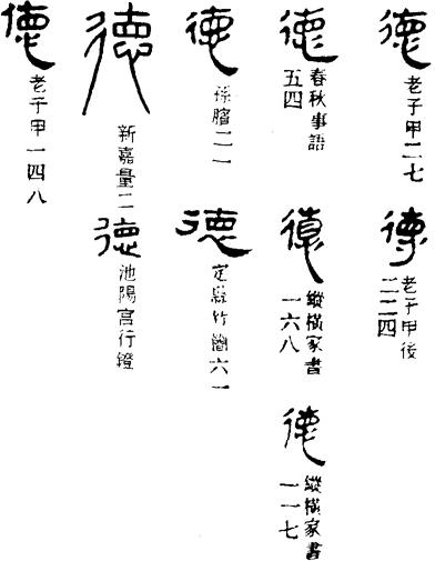 【说明】“德”为会意字。甲骨文像眼睛盯着道路认真地走路。所以引申为行为。参附录三。