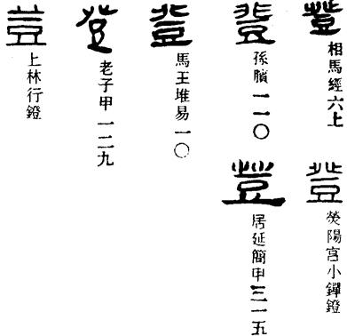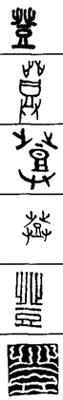 从上到下依次是小篆、甲骨文、金文、古玺及战国文字、缪篆及汉代文字、鸟虫篆。