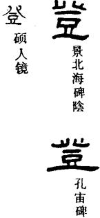 甲骨文、金文中的登字,象人两手捧豆(古代用以盛放食器的一种高脚盘)向上供奉的样子,“豆”上两个“止”形,表示向前进献的动作。所以登字本义为向上进奉,引申为上升、登高、前进等义。