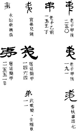 〈辨〉弟字甲骨文字形象以皮条、绳索绕束多根细竹为柲的样子,柲读bì,为古代兵器的柄;引申有次第义,用为兄弟的专字。弟为次第在后者。篆书讹变,楷书作弟。