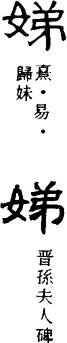 ①嫁给同一丈夫的女子当中的年轻者。《周易·归妹》:“归妹以娣。”《左传·隐公三年》:“其娣戴妫生桓公。”泛指妹妹。《左传·哀公十一年》:“疾使侍人诱其初妻之娣。”(疾:卫国大夫名。)②同一丈夫的妾。《诗经·大雅·韩奕》:“诸娣从之,祁祁如云。”③妯娌中的年轻者。《仪礼·丧服》:“娣姒妇者,弟长也。”