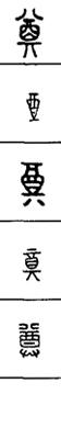 从上到下依次是小篆、甲骨文、金文、古玺及战国文字、缪篆及汉代文字、鸟虫篆。