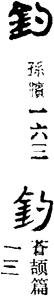 Ф096《雙恩記》:“屠宰煞戮於牛羊,捕獵羅釣於魚雀。”按:“釣”、“鈞”二字多有相亂之例,應據上下文來加以判別。參“鈞”字條。