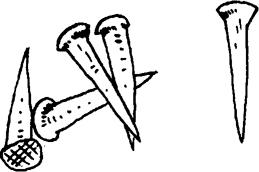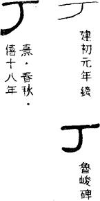 丁是个再简单不过的字,一横一竖钩,好写又易认,似乎只有文盲才不识,所以过去常用“目不识丁”这样一个成语来挖苦那些不学无知的人。那么丁字到底是个什么东西呢?不说出来你可能还真不知道哩!甲骨文、金文中的丁字,原来只是一颗钉子的形象:从上面俯视,是圆形(或方形)的钉帽;从侧面看,则好似一个楔子,所以丁字的本义就是钉子。丁是“钉”的本字。