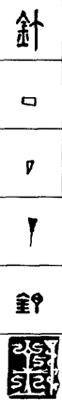 从上到下依次是小篆、甲骨文、金文、古玺及战国文字、缪篆及汉代文字、鸟虫篆。