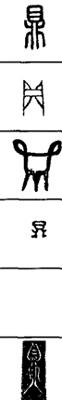从上到下依次是小篆、甲骨文、金文、古玺及战国文字、缪篆及汉代文字、鸟虫篆。