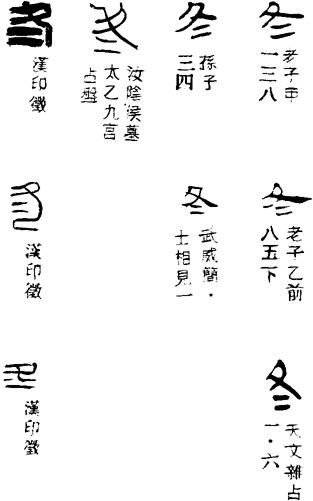 ,古文終。”段玉裁注:“絿之言糾也。”《甲骨文字典》謂:“絿絲即糾束絲結於終端,此即冬之本義。”但後世以冬為冬夏字,如秦封宗邑瓦書:“四年,周天子使卿大夫辰來致文武之酢(胙),冬十壹月辛酉,大良造庶長游出命曰……”冬既為冬夏字,乃復增糸為終以為終始專字。又馬王堆帛書《六十四卦·訟》:“克〈中〉吉,冬兇(凶)。”初六:“不永所事,少(小)有言,冬吉。”又《六十四卦·比》初六:“有復(孚)盈缶,冬來或(有)池(它)。”又《六十四卦·既濟》:“初吉,冬乳(亂)。”六四:“襦有衣茹(袽),冬日戒。”又《六十四卦·夬》上六:“无號,冬有兇。”又《六十四卦·旅》六五:“射雉,一矢亡,冬以舉(譽)命。”以上諸冬字通行本《易》皆作終。終字已見帛書《六十四卦·筭(巽)》九五:“……无〔初〕有終。”帛書《老子》甲本《德經》:“塞其悶,閉其門,終身不堇(勤)。”其時冬、終通用無别。帛書《老子》乙本卷前古佚書:“誥誥(皓皓)作事,毋從我冬始。”“冬始”即“終始”。又銀雀山竹簡《孫子兵法·勢》:“冬而復始,日月是……”十一家本作:“終而復始,日月是也。”又銀雀山簡《晏子》五:“景公登洛(路)