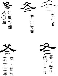 〈辨〉冬字甲金文形体象绳的一端,为终的初文,冬季为一年四季的末尾,所以借用来表示季节。篆书字形讹变,下部加形符仌;仌为古冰字,象形,楷书用作偏旁讹变作冫,俗称两点水儿,详冰字下。楷书作冬。鼕字从鼓冬声,是冬2的本字。简化作冬,是假借用法。