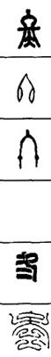 从上到下依次是小篆、甲骨文、金文、古玺及战国文字、缪篆及汉代文字、鸟虫篆。