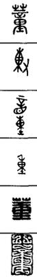 从上到下依次是小篆、甲骨文、金文、古玺及战国文字、缪篆及汉代文字、鸟虫篆。