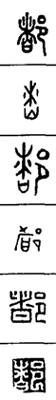 从上到下依次是小篆、甲骨文、金文、古玺及战国文字、缪篆及汉代文字、鸟虫篆。