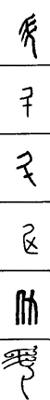 从上到下依次是小篆、甲骨文、金文、古玺及战国文字、缪篆及汉代文字、鸟虫篆。