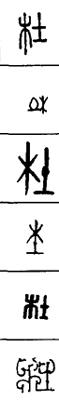 从上到下依次是小篆、甲骨文、金文、古玺及战国文字、缪篆及汉代文字、鸟虫篆。