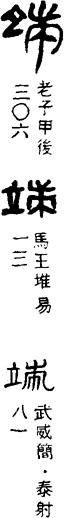 ,读duān,甲骨文象植物初生根芽的样子,上略同止,象示枝叶,下象根须,从点象水,表示植物得水而活;金文、篆书略象植物地下生根地上出芽的形状;引申为义项⑤⑥⑦⑧⑨。今概用端◇端瑞形近易混,瑞读ruì,形符从玉,本义为玉制信物。