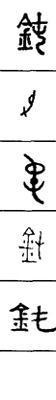 从上到下依次是小篆、甲骨文、金文、古玺及战国文字、缪篆及汉代文字、鸟虫篆。