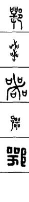 从上到下依次是小篆、甲骨文、金文、古玺及战国文字、缪篆及汉代文字、鸟虫篆。