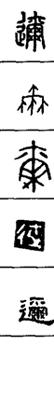 从上到下依次是小篆、甲骨文、金文、古玺及战国文字、缪篆及汉代文字、鸟虫篆。