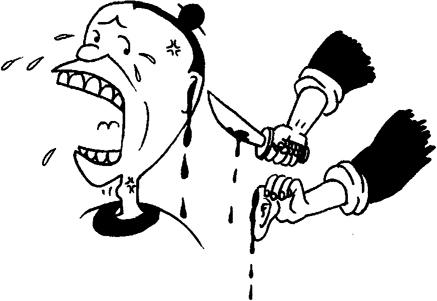 在战场上割取死人的耳朵,是为了报功;而在平时割取活人的耳朵,则是为了惩罚。刵是古代的一种常用肉刑,即用刀割去活人的耳朵。反映在字形上,刵字从耳,从刀,表示以刀割耳之意。《说文解字》:“刵,断耳也。从刀,从耳。”