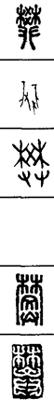 从上到下依次是小篆、甲骨文、金文、古玺及战国文字、缪篆及汉代文字、鸟虫篆。