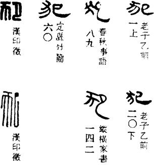 从上到下依次是小篆、甲骨文、金文、古玺及战国文字、缪篆及汉代文字、鸟虫篆。
