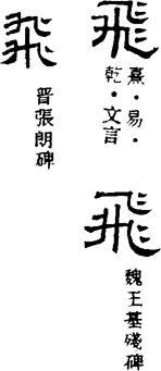 小篆的飞字,象鸟儿张开翅膀在空中飞翔的样子,它的本义即指飞翔。引申言之,则凡物在天空飘荡,都叫做“飞”,如飞蓬、飞雪。飞字还可用来形容快速、急促之意。