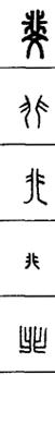 从上到下依次是小篆、甲骨文、金文、古玺及战国文字、缪篆及汉代文字、鸟虫篆。