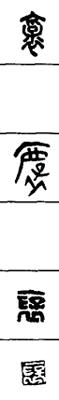 从上到下依次是小篆、甲骨文、金文、古玺及战国文字、缪篆及汉代文字、鸟虫篆。