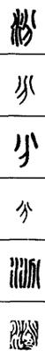 从上到下依次是小篆、甲骨文、金文、古玺及战国文字、缪篆及汉代文字、鸟虫篆。