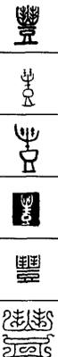 从上到下依次是小篆、甲骨文、金文、古玺及战国文字、缪篆及汉代文字、鸟虫篆。