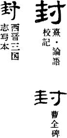 〈辨〉封字甲金文皆象植树于土堆之形,金文形体稍繁从又,义为封疆,古时以林木为疆界;引申为分封字。篆书字形讹变作从之从土从寸。楷书作封。