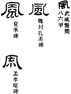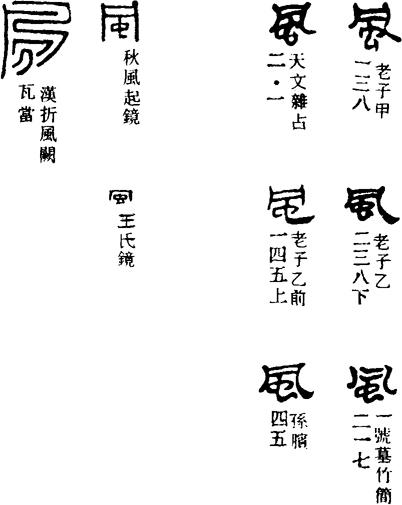 风是一种空气流动的现象。它无色无形,不可捉摸,更难以用具体的形象来描摹。在甲骨文中,常借用同音的“凤”字来代替风字。但风、凤毕竟毫无形义上的关系。篆书风字从虫凡声,乃以虫为义符。虫在这里专指老虎,即所谓的“大虫”。古人有“云从龙,风从虎”的说法,认为风从虎生,故风字得以从虫。