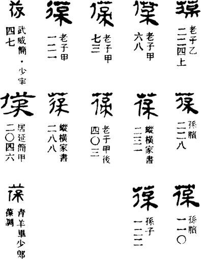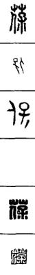 从上到下依次是小篆、甲骨文、金文、古玺及战国文字、缪篆及汉代文字、鸟虫篆。