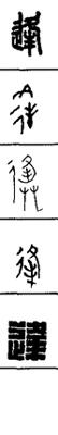 从上到下依次是小篆、甲骨文、金文、古玺及战国文字、缪篆及汉代文字、鸟虫篆。